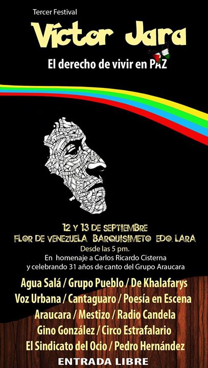 01 - 09 - 2014.- El viernes 12 y el sábado 13 de septiembre serán dos días dedicados, en su totalidad, a la diversidad cultural. La Flor de Venezuela será testigo de la III edición de un acto histórico: el Festival “Víctor Jara”. Música, artesanía, gastronomía, poesía, expo-venta, entre otras actividades son las previstas en un cronograma concebido para el compartir de toda la familia.